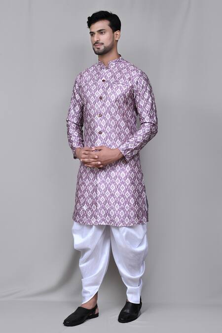 Light purple printed jacquard art silk kurta with geometric pattern. Paired with white cowl pant.