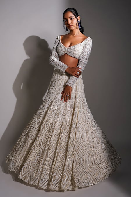 Ivory lehenga with all-over tonal embroidery in a geometric pattern. Comes with embroidered full length sleeves blouse and dupatta.