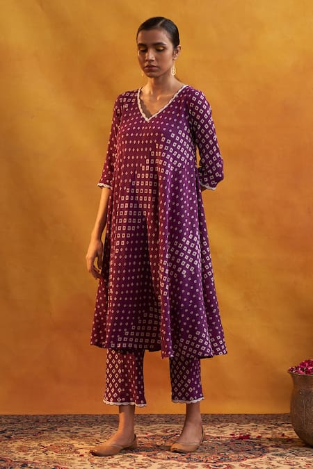 Deep purple bias cut kurta with geometric prints with hand embroidered details on neckline. Comes with printed pant.