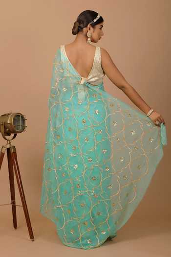 Sea green pre-draped saree handcrafted in weightless chiffon, showcasing gota jaal work and a soft luminous finish. Paired with a matching stitched crepe blouse tailored for a sleek fit.