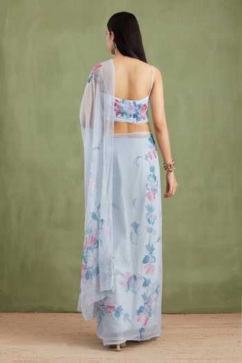 Sky Blue Chiffon Sweetheart Neck Handpainted Floral Pre-draped Saree With Blouse