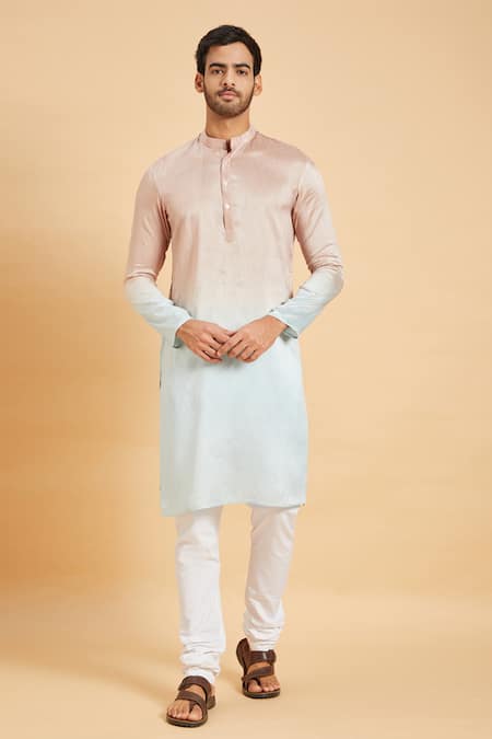 Pink to light pastel teal ombre kurta featuring a band collar and full sleeves. Paired with straight fit crop pant and includes pockets and side slits.