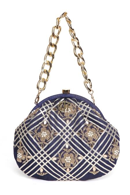 Blue raw silk vintage pouch with floral, checkered pattern zardozi & gota patti lace work. Comes with detachable gold metallic chain.