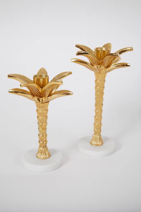 Gold Alloy Oasis Palm Tree Candle Stand Set Of 2
