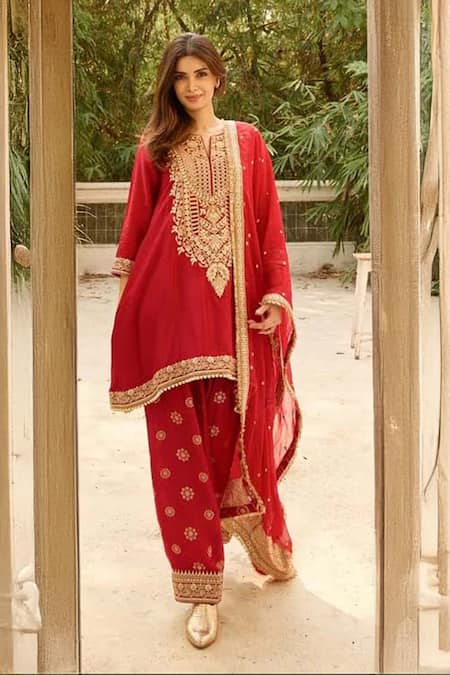 Red Tussar, Organza Embroidery, Zari, Sequins Misha Floral Kurta Salwar Set