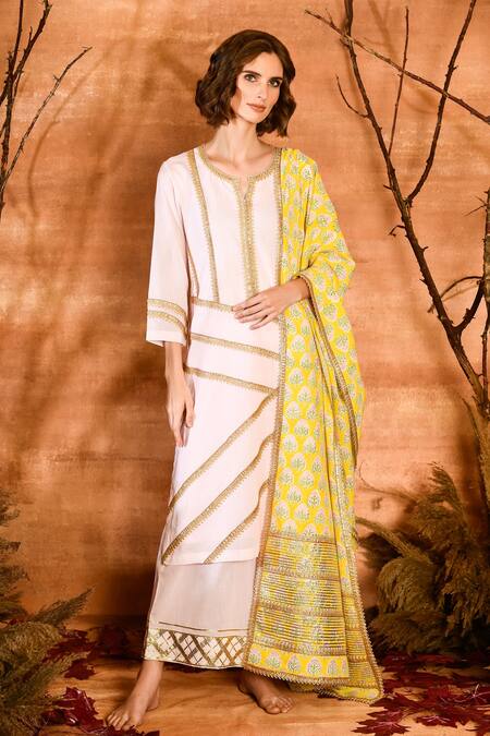 Pink kurta with notched neckline & gota embroidery. Paired with geometric embroidered palazzo & printed dupatta.