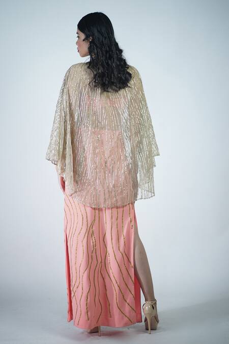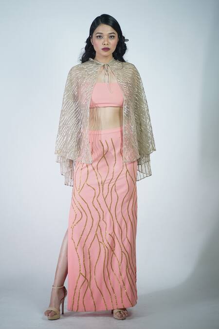 Pink skirt featuring gota embroidery with slit detailing. Paired with a padded blouse in cotton fabric.