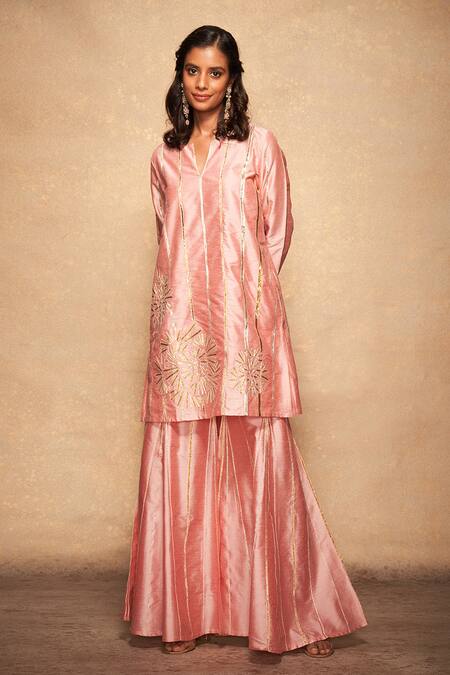 Pink short kurta in a pure chanderi silk base, with gota patti trims and placement rose embellished motif at the hem.