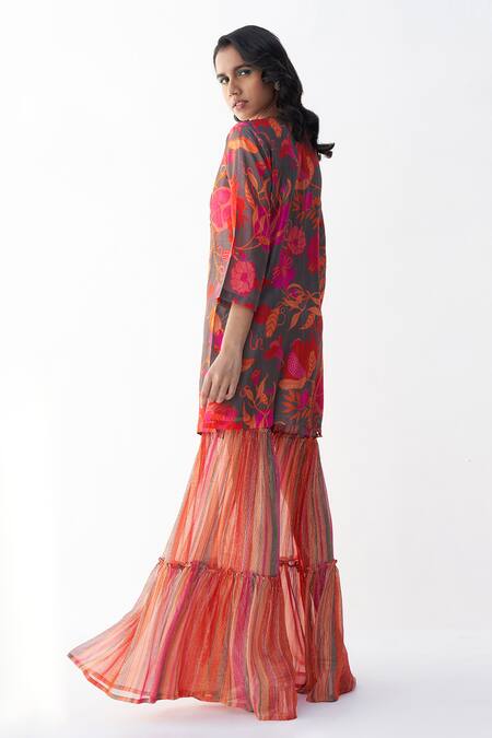 Grey silk kurta featuring pink pomegranate pattern and zardozi embroidery on the yoke. Paired with a stripe pattern sheer sharara and a dupatta with pomegranate border.