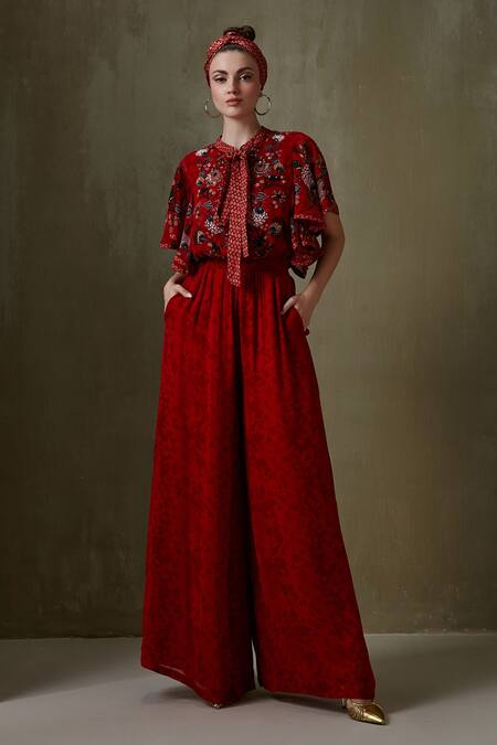 Burgundy jumpsuit with floral print, embellishment & front tie-up detailing.