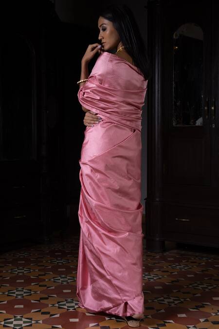 Pink saree with geometric motifs woven on the border and frayed pallu. Comes with unstitched blouse fabric.