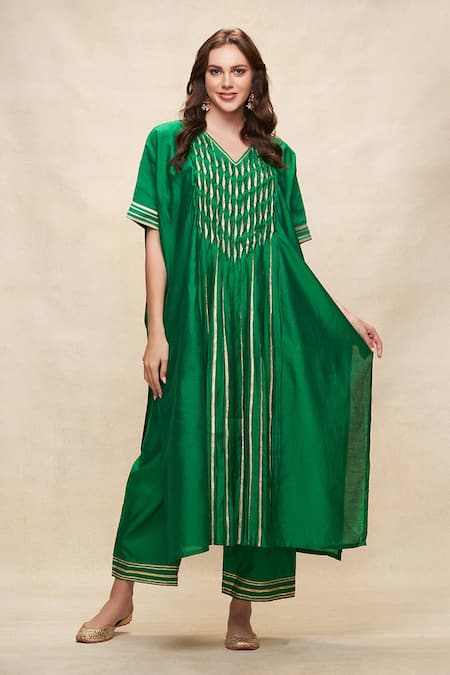 Buy_Gulabo By Abu Sandeep_Green Chanderi Gota Patti V-neck Embroidered Pleated Kaftan _Online_at_Aza_Fashions