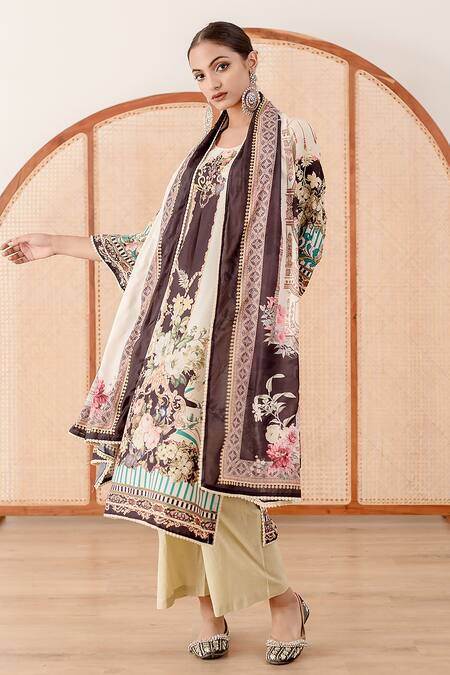 Cream kurta with flower, geometric printed motifs & lace borders. Paired with pant & printed dupatta.