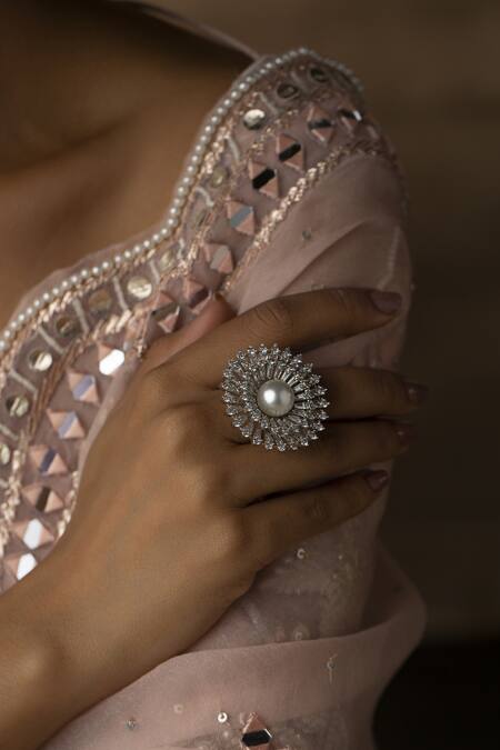 Buy_Paisley Pop_Silver Plated Cubic Zirconia And Shell Pearls Ring_at_Aza_Fashions