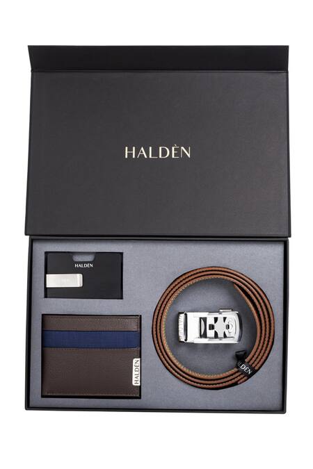 Stanley brown belt with silver classic glossy buckle. Comes with wallet which include multiple card slots, compartments, cash pockets & sleek metal nero card holder.