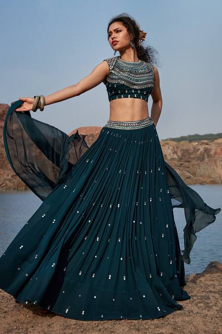 Green Georgette Mirror, Resham Halter Neck Blouse And Lehenga Set