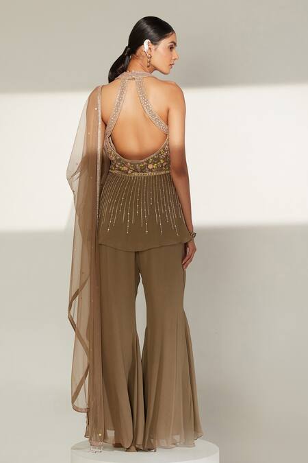 Buy_Amitabh Malhotra_Green Georgette And Soft Net Floral, Couture Halter Neck Peplum Sharara Set_at_Aza_Fashions