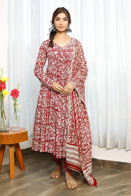 Red anarkali with floral hand block prints. Comes with pant & chanderi dupatta.