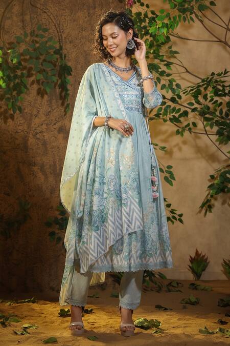 Ice blue angrakha anarkali with floral, chevron placement print & mirror embroidered yoke. Paired with pant & dupatta.
