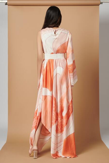 Orange one shoulder sleeve asymmetric draped dress with printed patterns. Comes with a white corset belt.