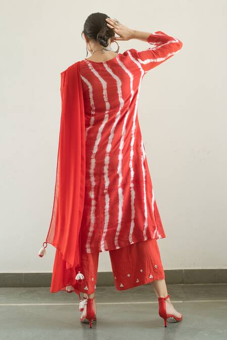 Red kurta featuring hand-tied & hand-dyed leheriya pattern with mirror embroidery and side seam pockets. Paired with cotton satin palazzo with elasticated waist and a georgette dupatta with tassel detailing.