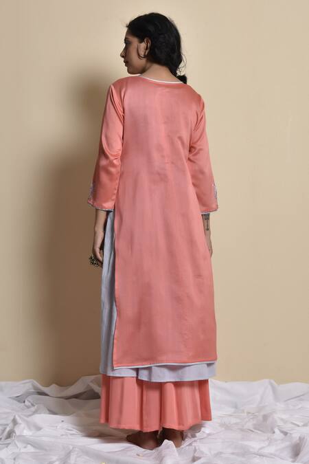 Coral Kurta Chanderi Inner Crincled Cotton Pant Hand Embroidered Set