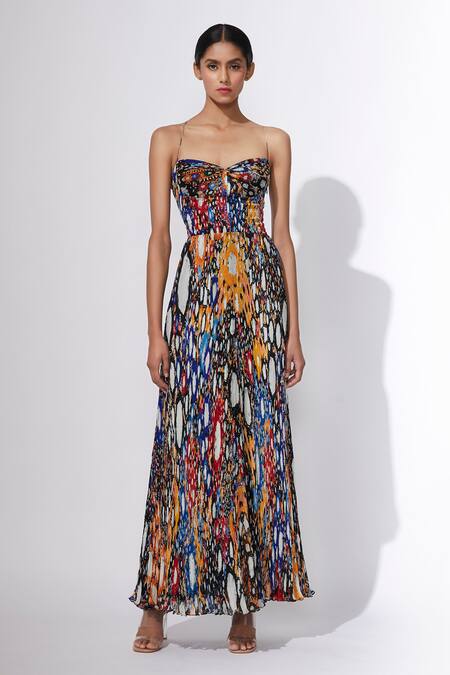 Multi-color flared maxi dress with all-over abstract print & hand micro pleats.