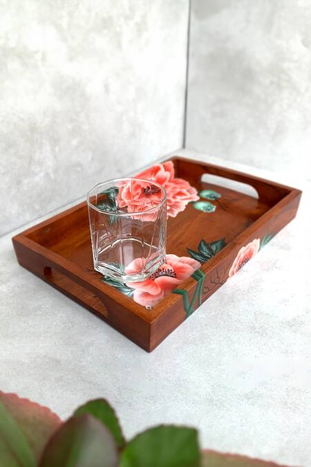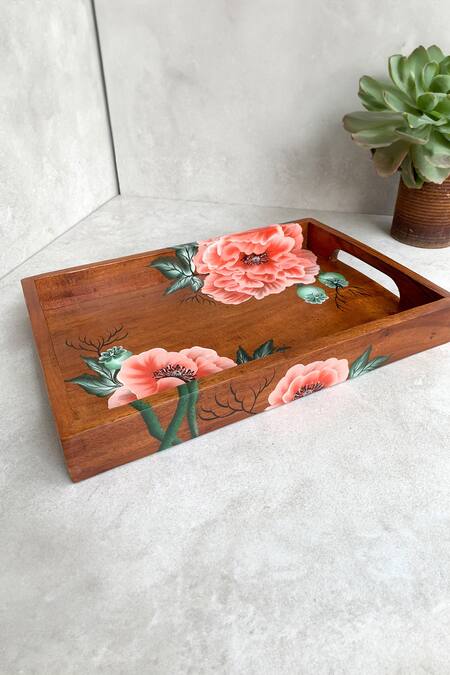 Brown handmade rectangle-shaped wooden tray with hand painted floral motifs & matt finished with food safe coating.