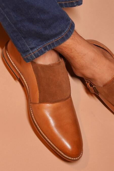 Brown shoes with almond-toe, stack heels, suede panel, burnish finish & single monk strap.