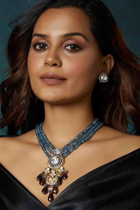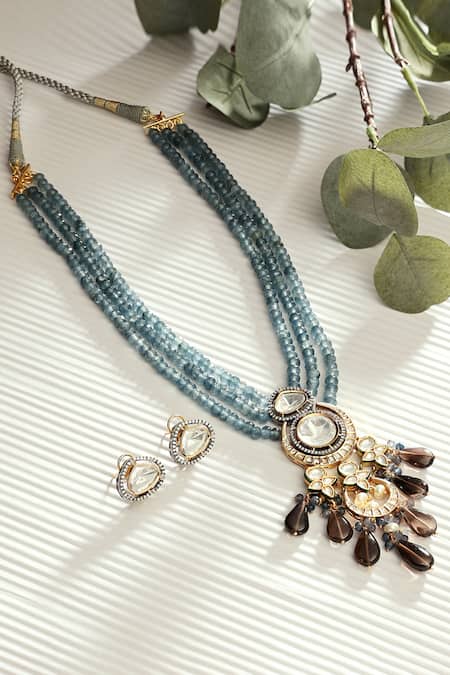 Antique finish pendant with intricate polki work, Smoky quartz stone drops, Multiple strands of blue agate beads