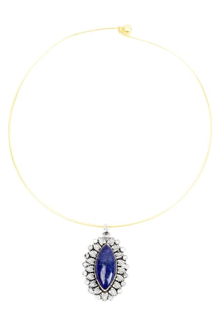 Lapis stone studded in carved silver pendant, 24k gold plated chain, Handcrafted with unique variations