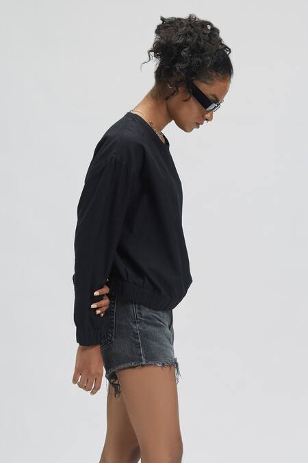 Black oxford handloom cotton plain sweatshirt with elastic details.