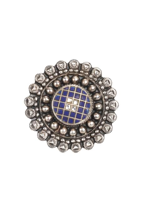 Beaded texture surrounding the central stone, Intricate carved details enhancing the floral design