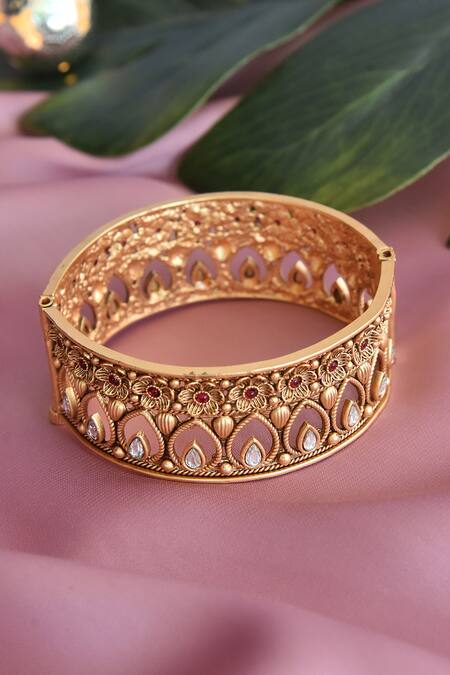 Gold toned kada with floral carvings & cutwork details & kundan, polki embellishments.
