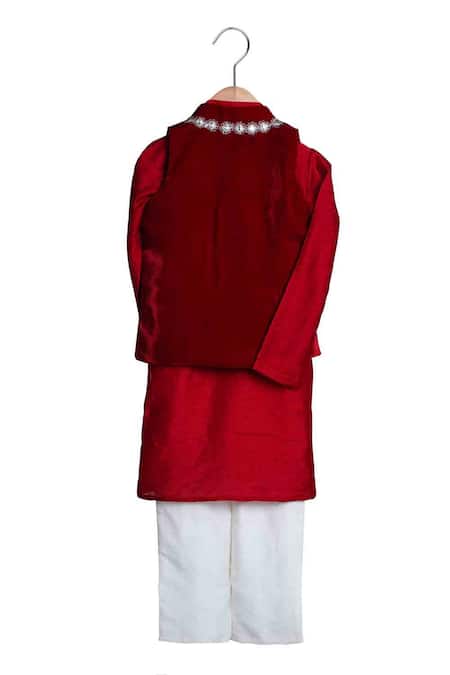 Ruby velvet bundi featuring a band collar and floral zari & gota hand embroidery. Paired with a full sleeves kurta and ivory relaxed fit pants.