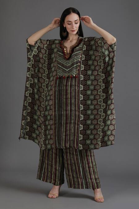 Buy_Preeti S Kapoor_Green Crepe Tassels V-neck Harmeen Flared Collage Print Kaftan With Pant_Online_at_Aza_Fashions