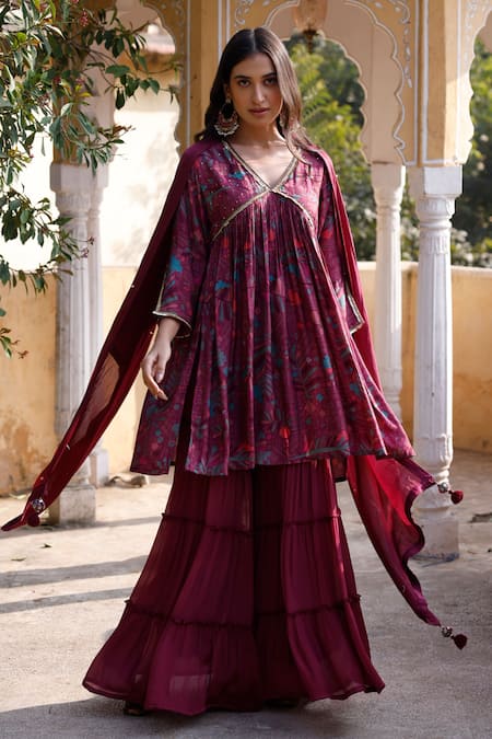 Wine floral printed anarkali featuring a V neck and three quarter sleeves. Paired with a tiered gharara and a tassel bordered sheer dupatta.