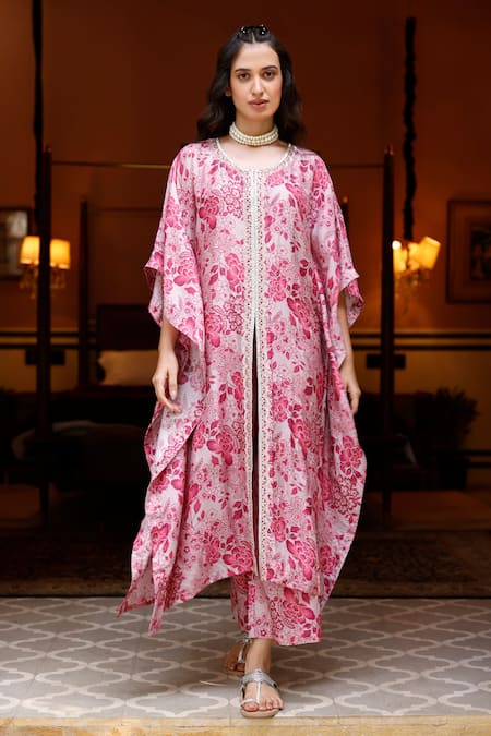 Pink floral printed kaftan featuring a U neck and embellished placket. Paired with a matching palazzo, it has kaftan sleeves and scallop bordered sleeve hems.