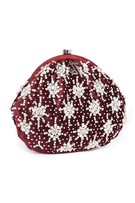 Red velvet pouch with glass stone, pearl, zardozi embellishment. Comes with detachable gold metal chain.