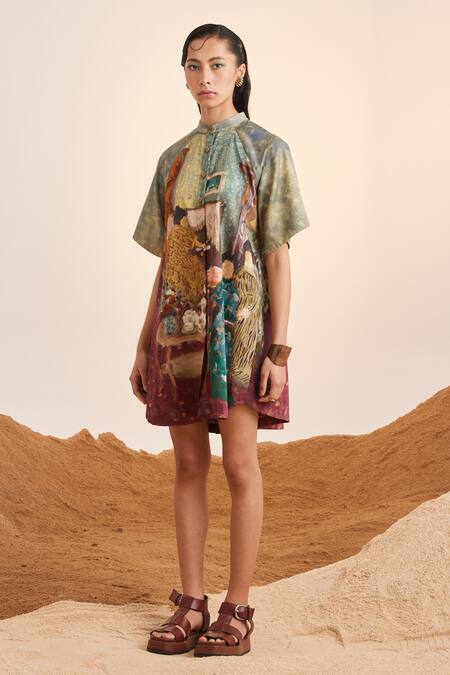Blue Cotton Satin Mandarin Collar High Tea Print A-line Dress
