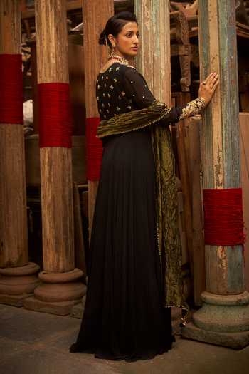 Black embroidered anarkali paired with an embroidered tissue dupatta.