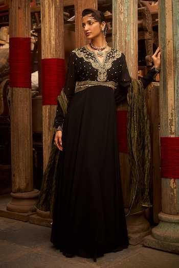 Black Georgette, Tissue Embroidery V-neck Anarkali And Dupatta Set