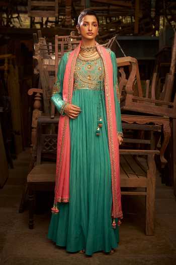 Aqua marodi-work angarkha with an embroidered peach dupatta. Paired with a churidar.
