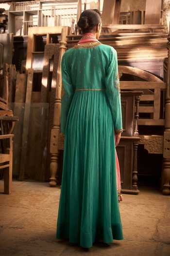 Aqua Cotton, Organza, Chanderi, Lycra Embroidery Round Neck Marodi Angarkha Set