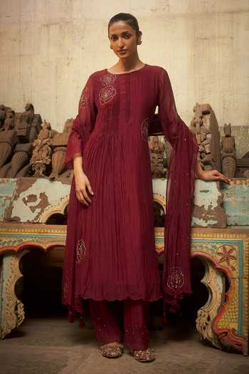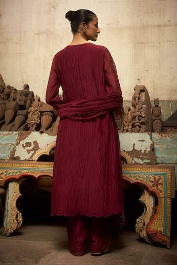 Burgundy Chanderi kurta with pleated texture and rose hand embroidery; paired with chanderi pant and scalloped dupatta.