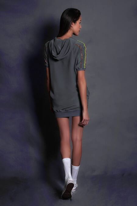 Grey hoodie dress featuring half sleeves and tie-up details at the neckline