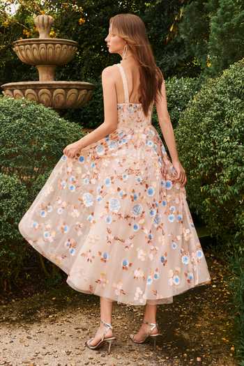 Silk thread floral embroidery, Drop waist fit-and-flare silhouette, Structured corset bodice