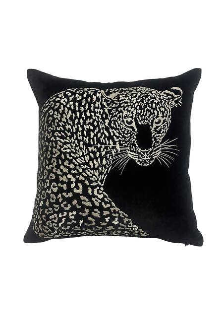 Black 100% Cotton Velvet Embroidery Snow Leopard Cushion Cover