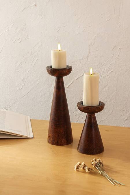 Coffee brown abstract cylindrical shaped set of 2 candle stand. Comes along with a mararikulam table runner.