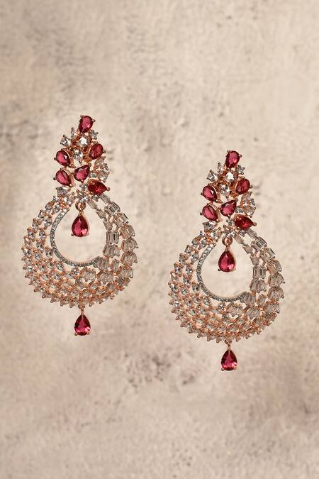 Rose based chandbali style earrings with red hydro stones & diamond embellishments.